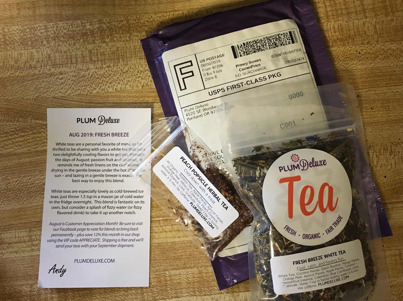 Plum Deluxe does a tea of the month program. I tried the 3 month program- June, July, and August. For August I got Fresh Breeze White Tea. When they send the tea they also send a free sample. This month was peach Popsicle herbal tea.
